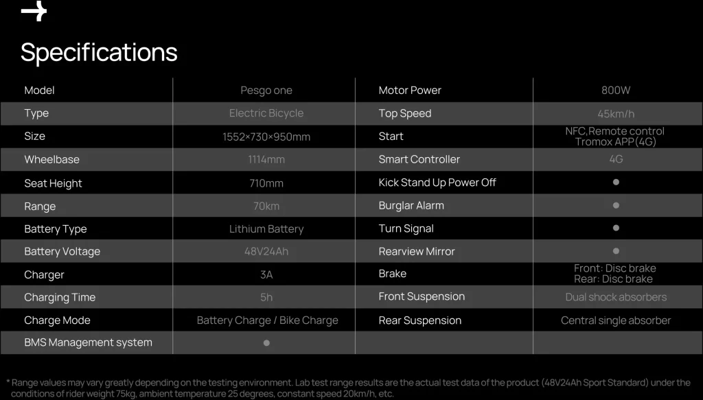 * Los valores de rango pueden variar mucho según el entorno de prueba. Los resultados del rango de pruebas de laboratorio son los datos de prueba reales del producto (48V24Ah Sport Standard) en condiciones de peso del ciclista de 75 kg, temperatura ambiente de 25 grados, velocidad constante de 20 km/h, etc.